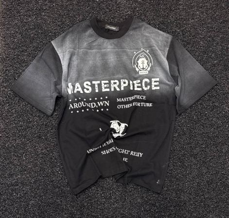 ویژگی برجسته این تیشرت، چاپ بزرگ و پررنگ کلمه "MASTERPIECE" در قسمت میانی آن است که با فونتی نیمه شکسته و حالتی هنری، مفهوم اثر هنری و شاهکار را به بیننده منتقل میکند. در اطراف این نوشته، عباراتی مانند "AROUND, WN"، "OTHER FORTUNE" و "UNITED REITY" با طراحیهای متنوع چاپ شدهاند که هر کدام به نوعی مفهوم برتری و منحصر به فرد بودن را القا میکنند.